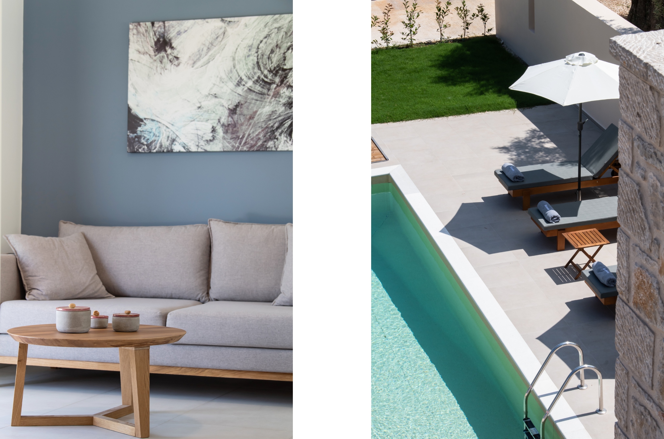The newly stone-built Villas are designed with a luxurious character that comes in all spaces. From modern interior architecture to handmade furniture, Rizomata Luxury Villas are the perfect destination for romantic getaways but also for friendly or family gatherings.
